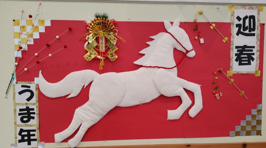 本年最初の壁面飾りは、タオルで作ったふわふわの馬の壁面年賀状です。